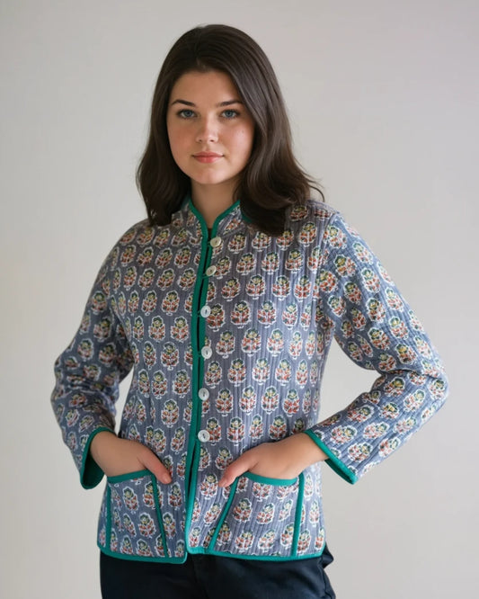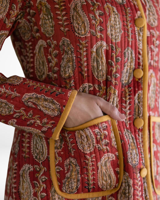 Wrap yourself in craftsmanship with our Jackets Collection, where tradition meets modern elegance. Each piece is meticulously quilted and hand block printed by skilled artisans in India, bringing centuries-old textile artistry to your everyday wardrobe. Made from premium-quality cotton, these jackets offer the perfect balance of warmth and breathability, making them versatile for any season—whether it’s a crisp spring morning or a breezy summer evening.