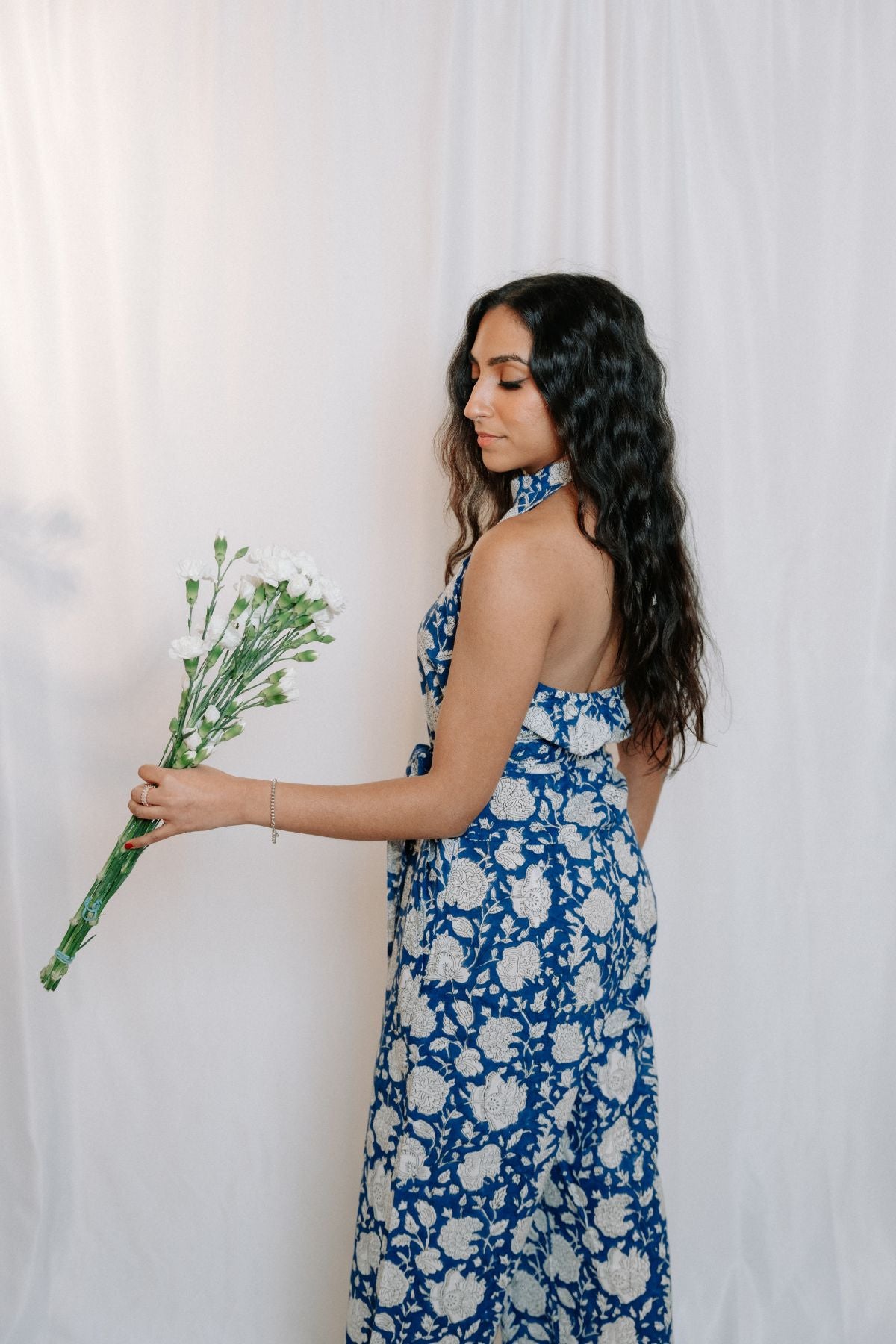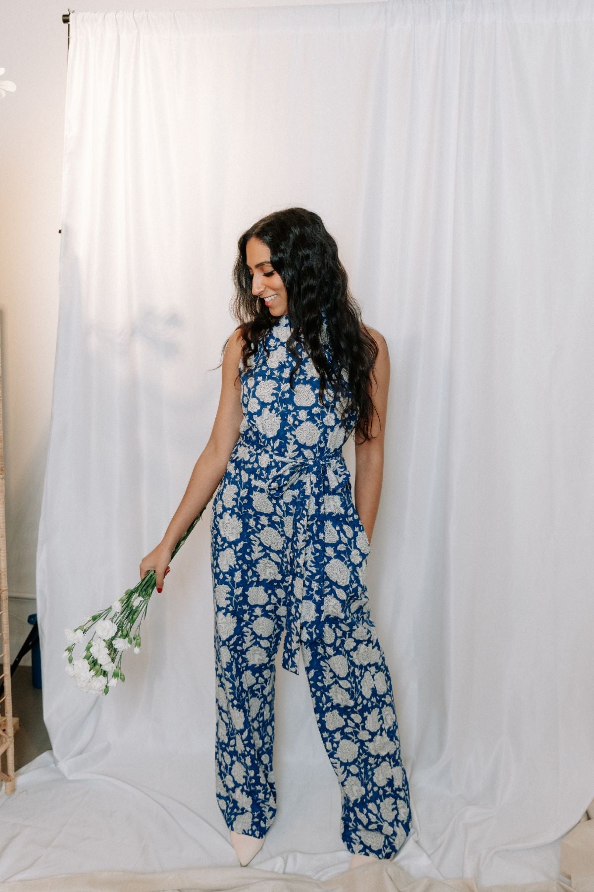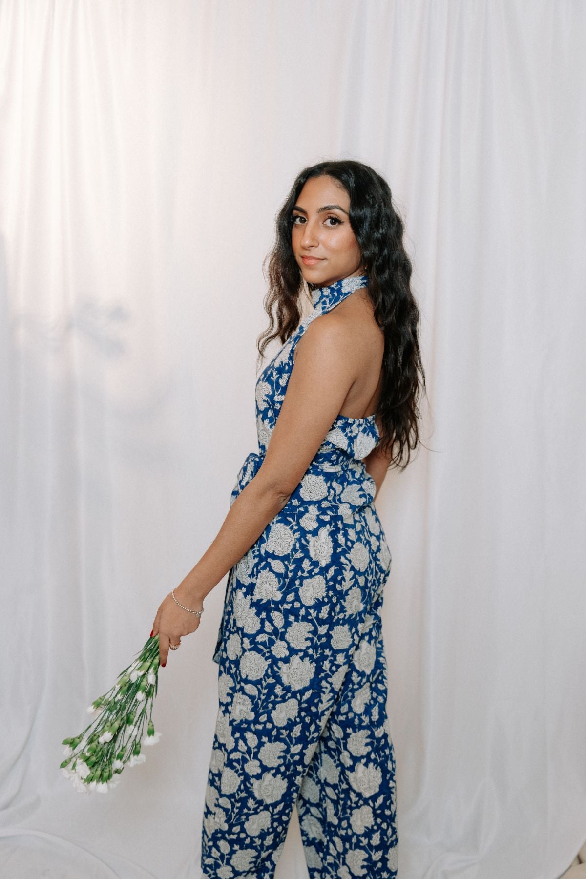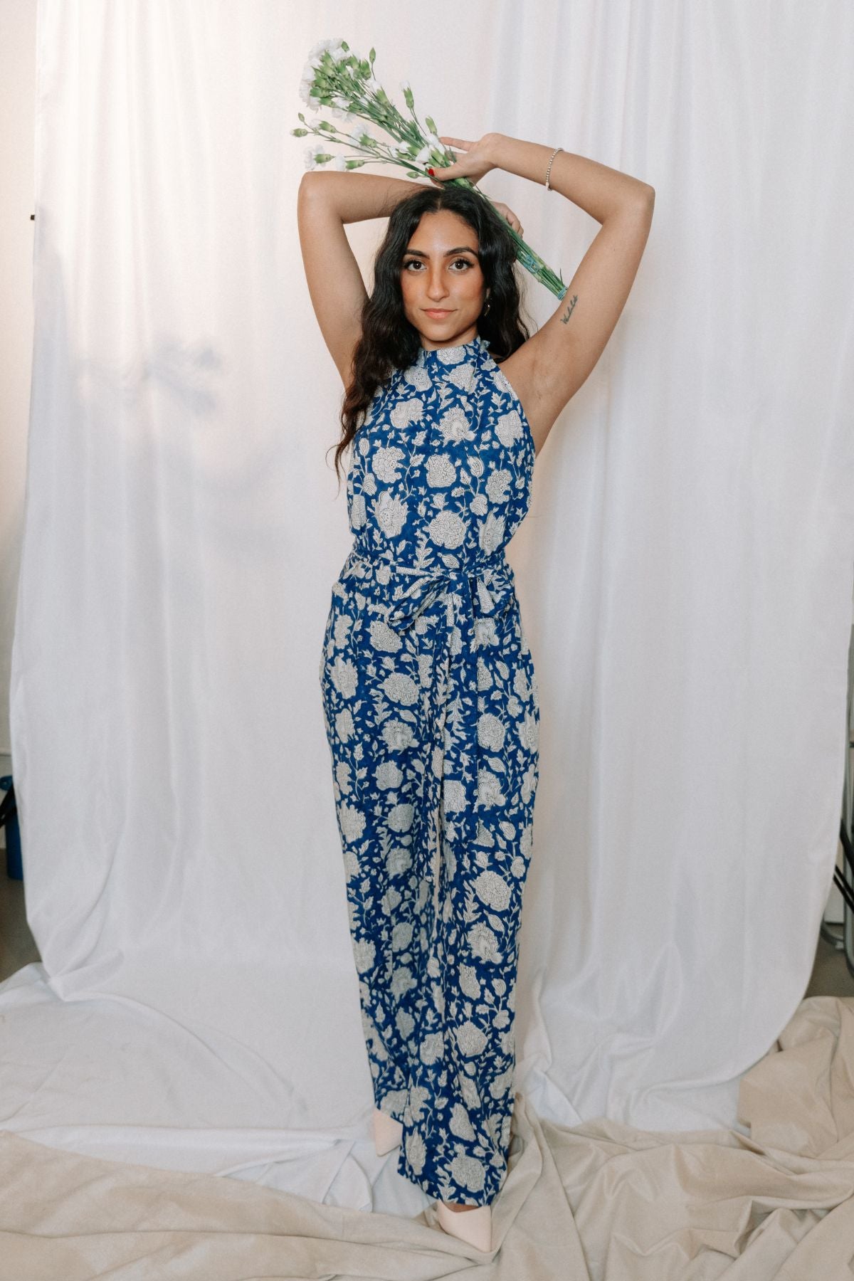 Handblock printed cotton jumpsuit featuring a halterneck top style and pockets!!