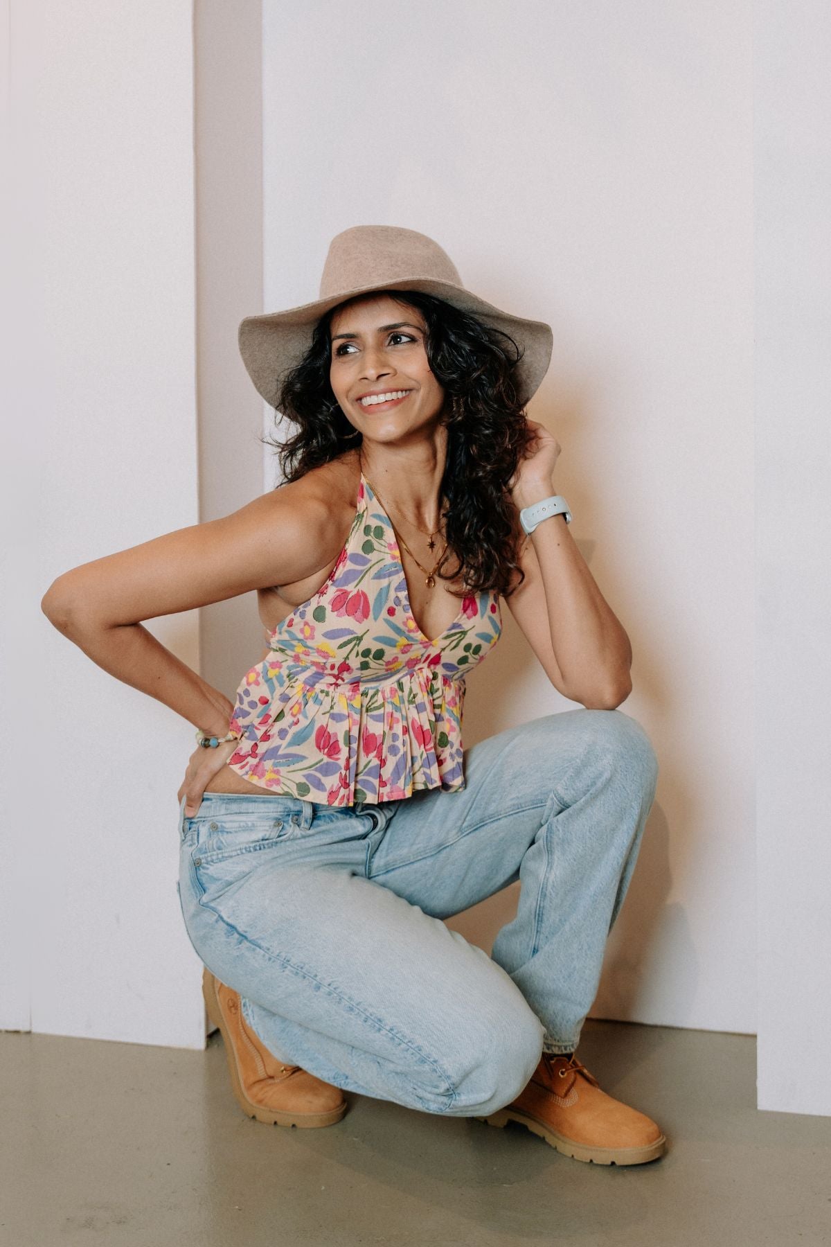 This playful and vibrant halter-neck top, crafted from breathable cotton, features a lively hand block print with a mix of colorful floral motifs on a soft beige background. The top has a flattering peplum shape that flows from the fitted bodice, and the back is beautifully designed with adjustable ties for a perfect fit. This piece is a cheerful addition to any wardrobe, ideal for adding a pop of color to your casual outfits. Pair it with your favorite jeans or shorts for a fun, summery look.