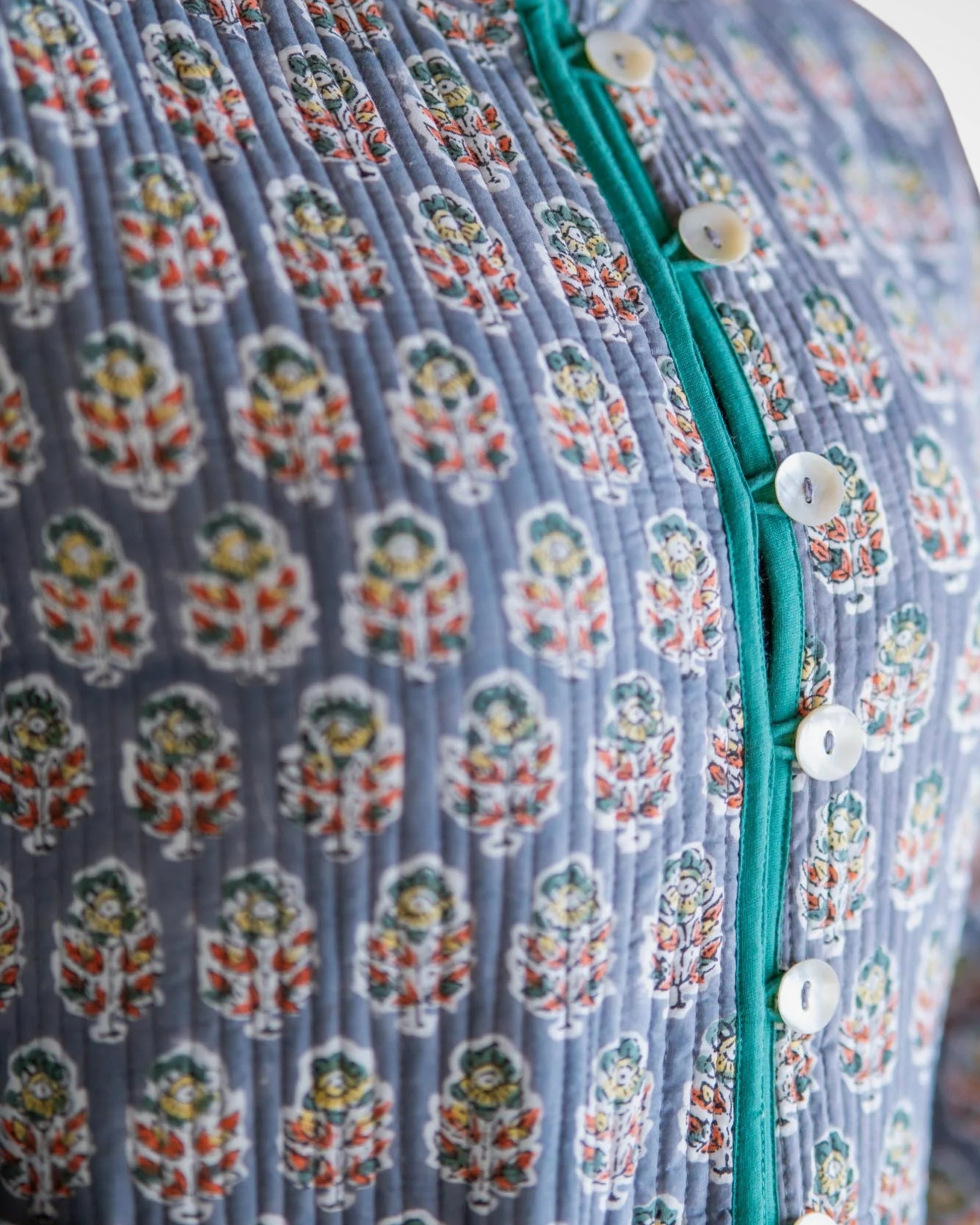 Twice the style, endless versatility. Celeste is a beautifully reversible quilted jacket, handcrafted by artisans in India using premium cotton and traditional hand block printing techniques. With one side featuring an elegant floral motif on a soft grey base and the other offering a fresh, complementary design, this jacket is perfect for switching up your look effortlessly. The lightweight, breathable fabric makes it ideal for layering across seasons, while the contrast piping, functional pockets, and button-down front add thoughtful detailing.