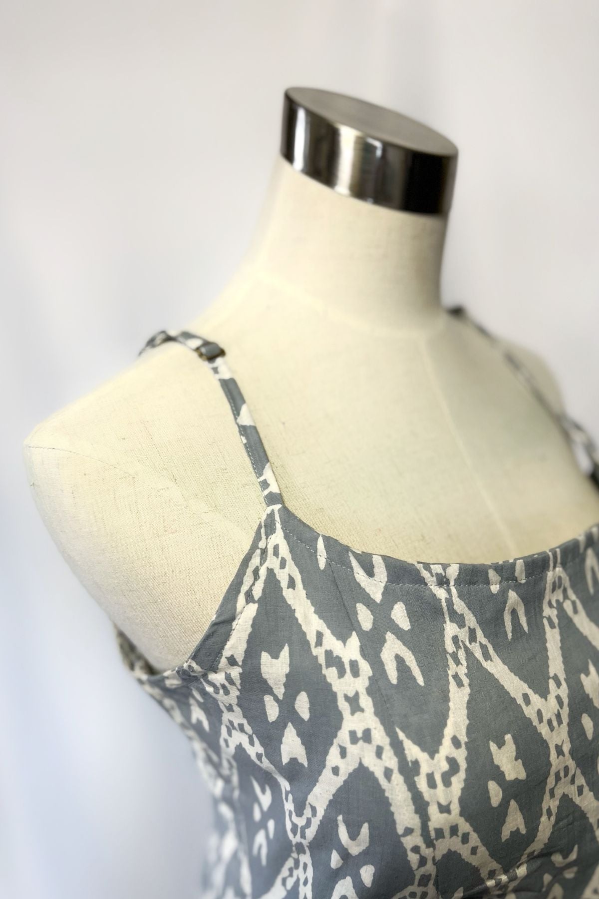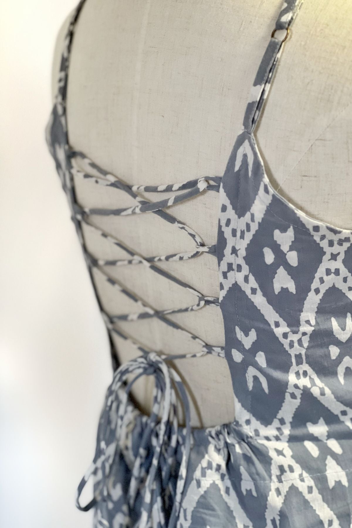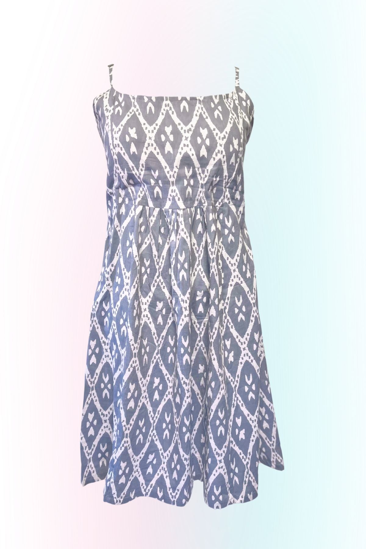 A perfect cotton summer mini dress! Gray features a cross tie back and it is padded with adjustable straps.