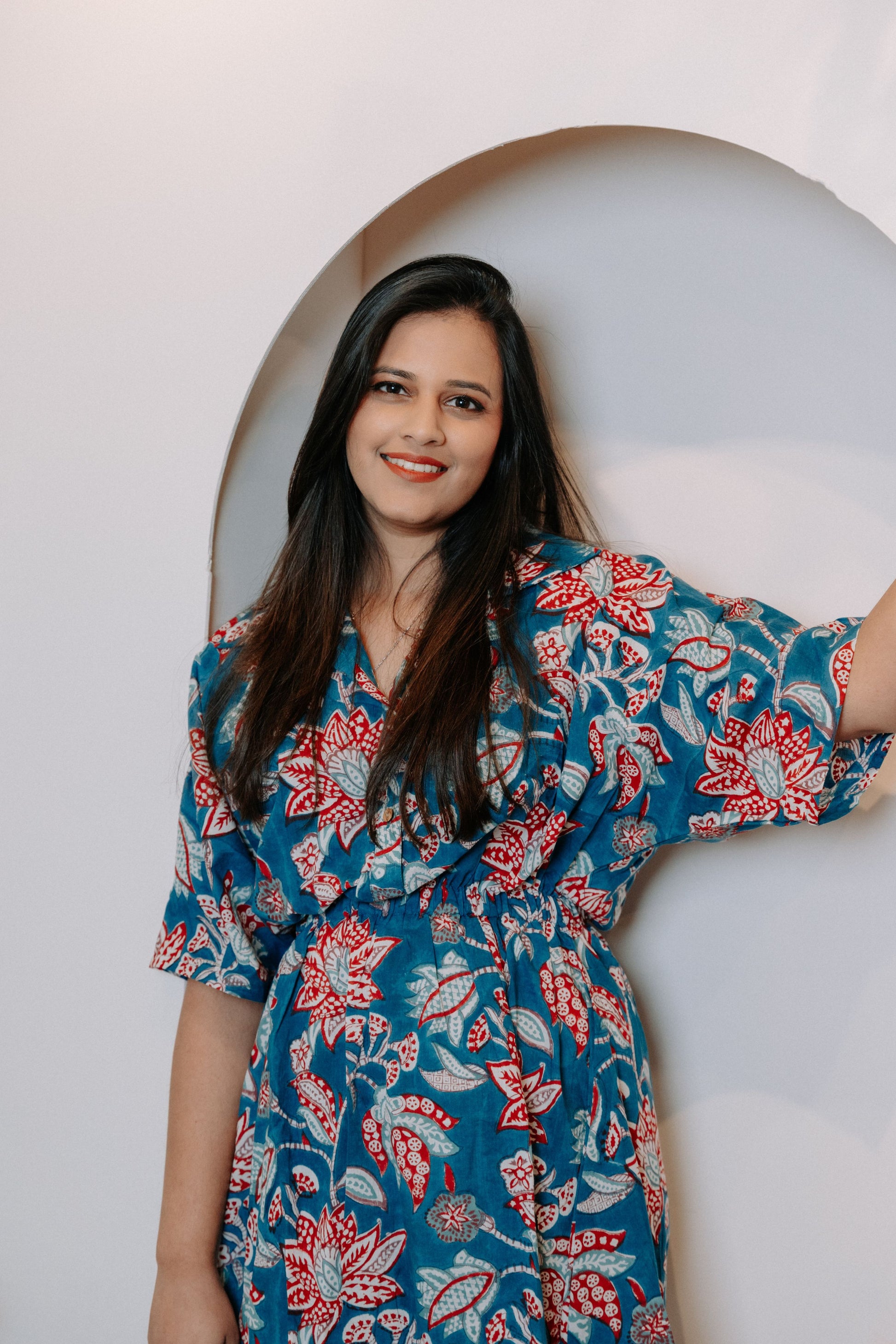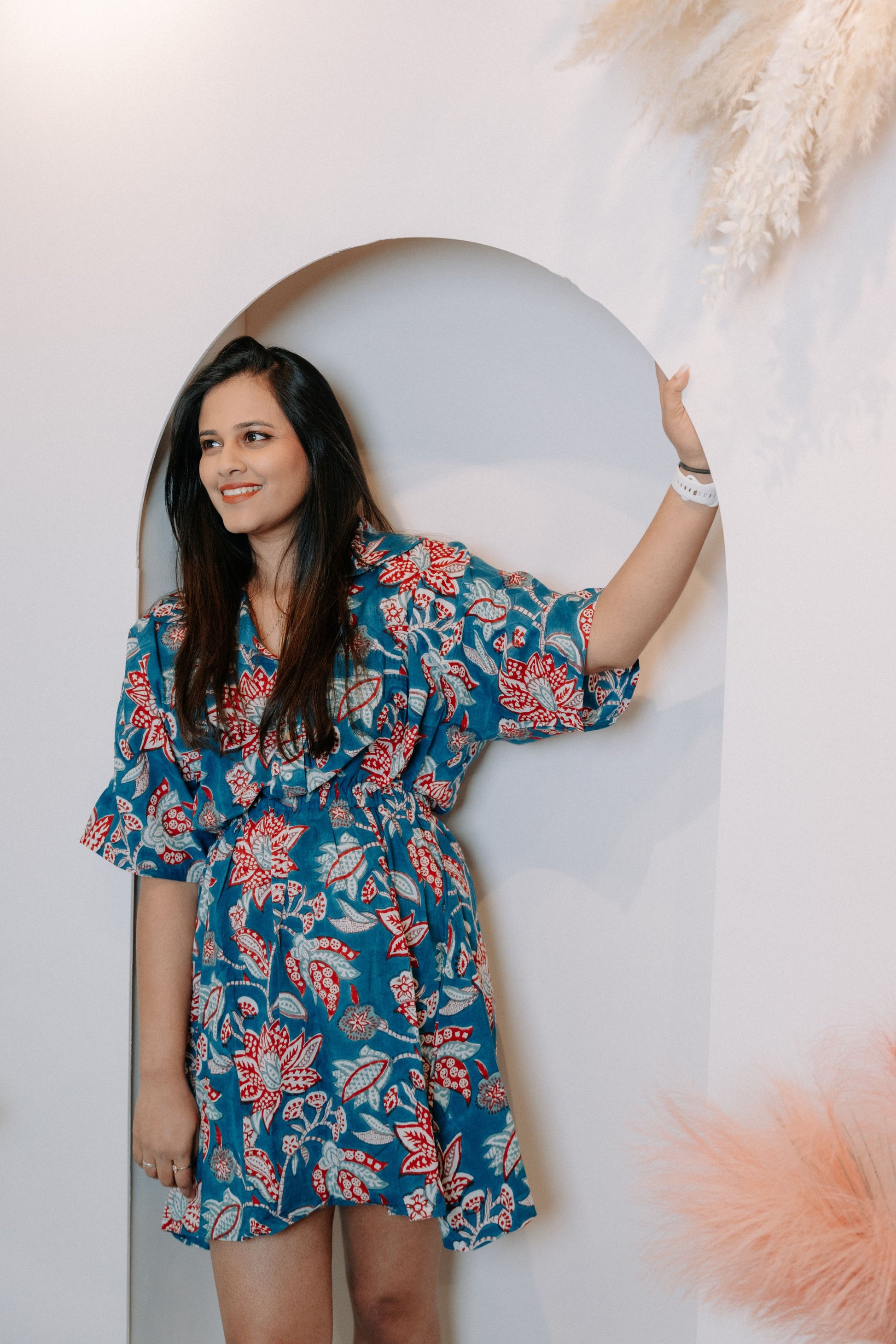 This vibrant dress features a stunning blend of rich blue tones with bold, red floral prints, bringing a fresh and lively energy to your wardrobe. The relaxed silhouette and cinched waist offer a flattering fit that's both comfortable and stylish. Perfect for any occasion, this dress combines traditional Indian-inspired patterns with a modern, flowy design, making it an ideal choice for those who want to make a statement with effortless elegance.