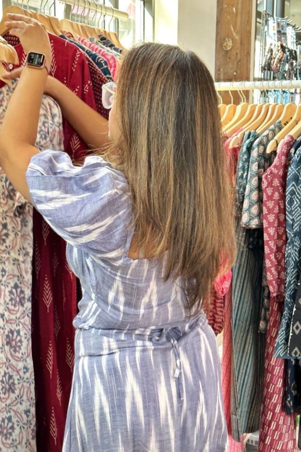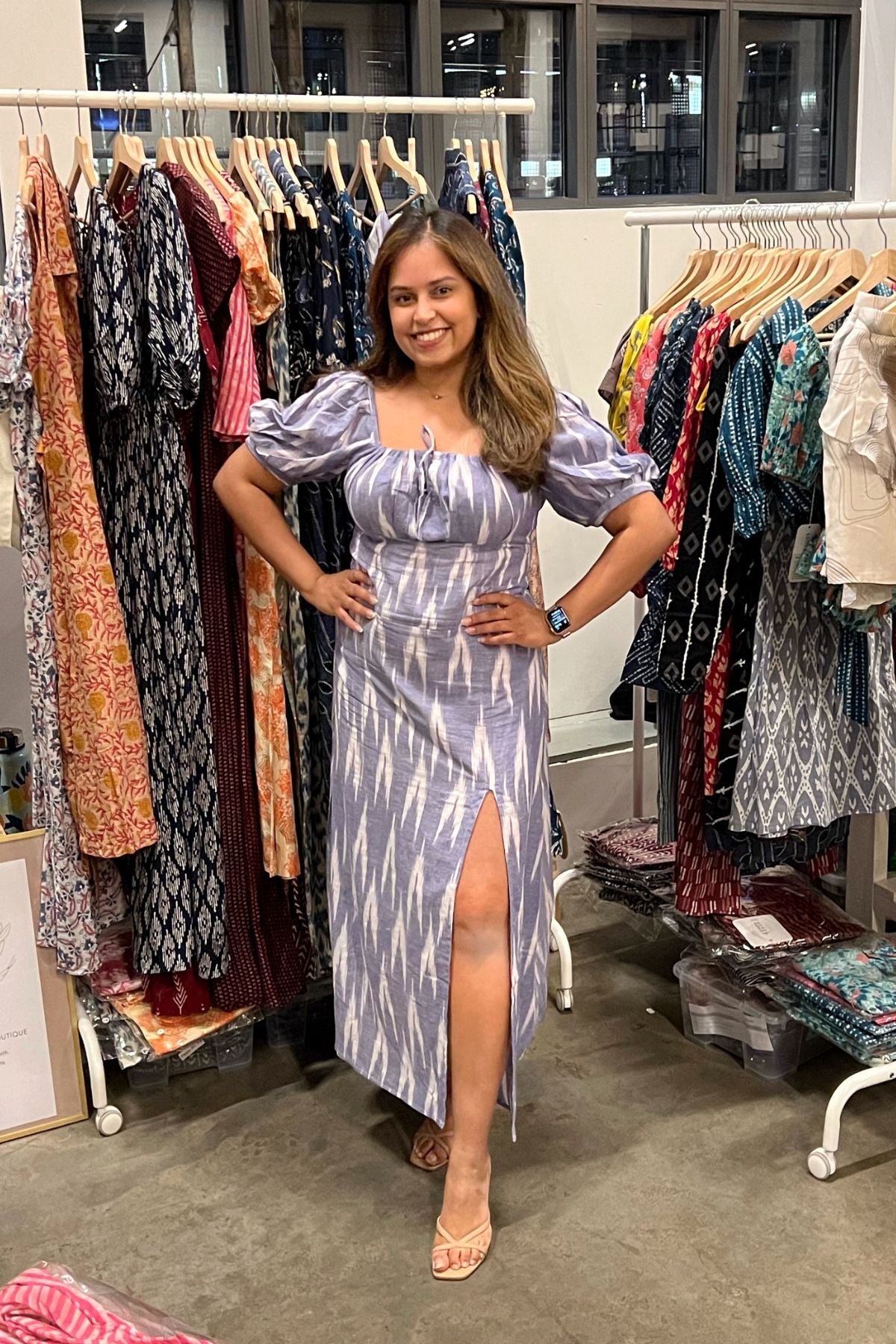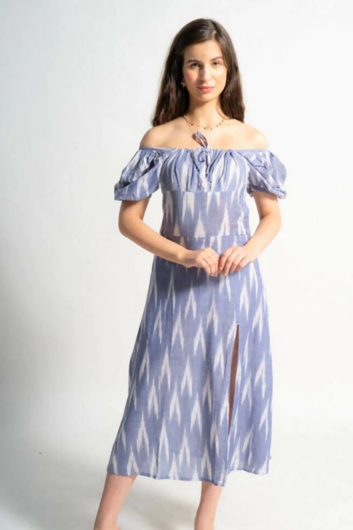 Hand block printed Ikat summer dress featuring an adjustable neckline and a knee high slit