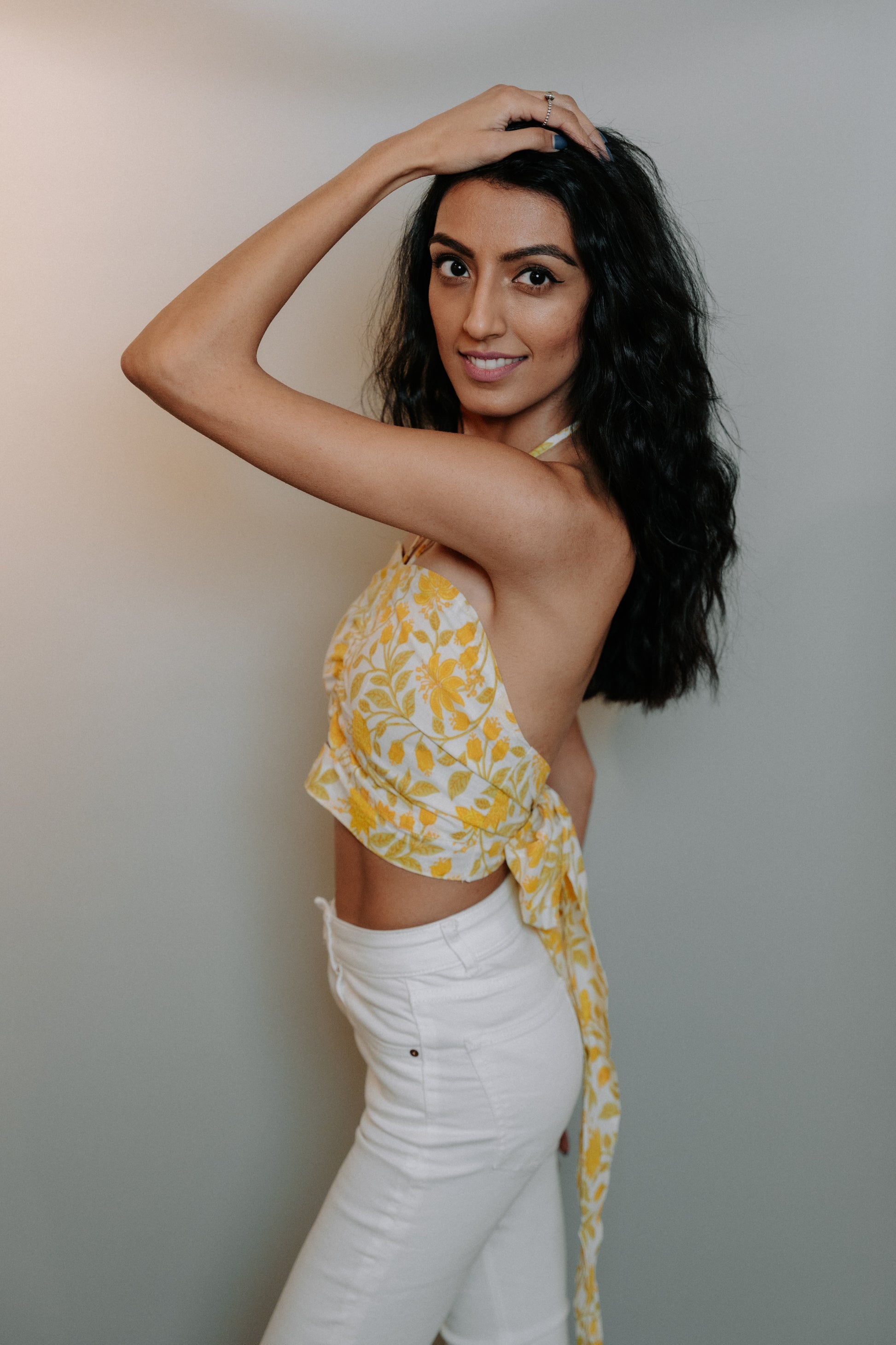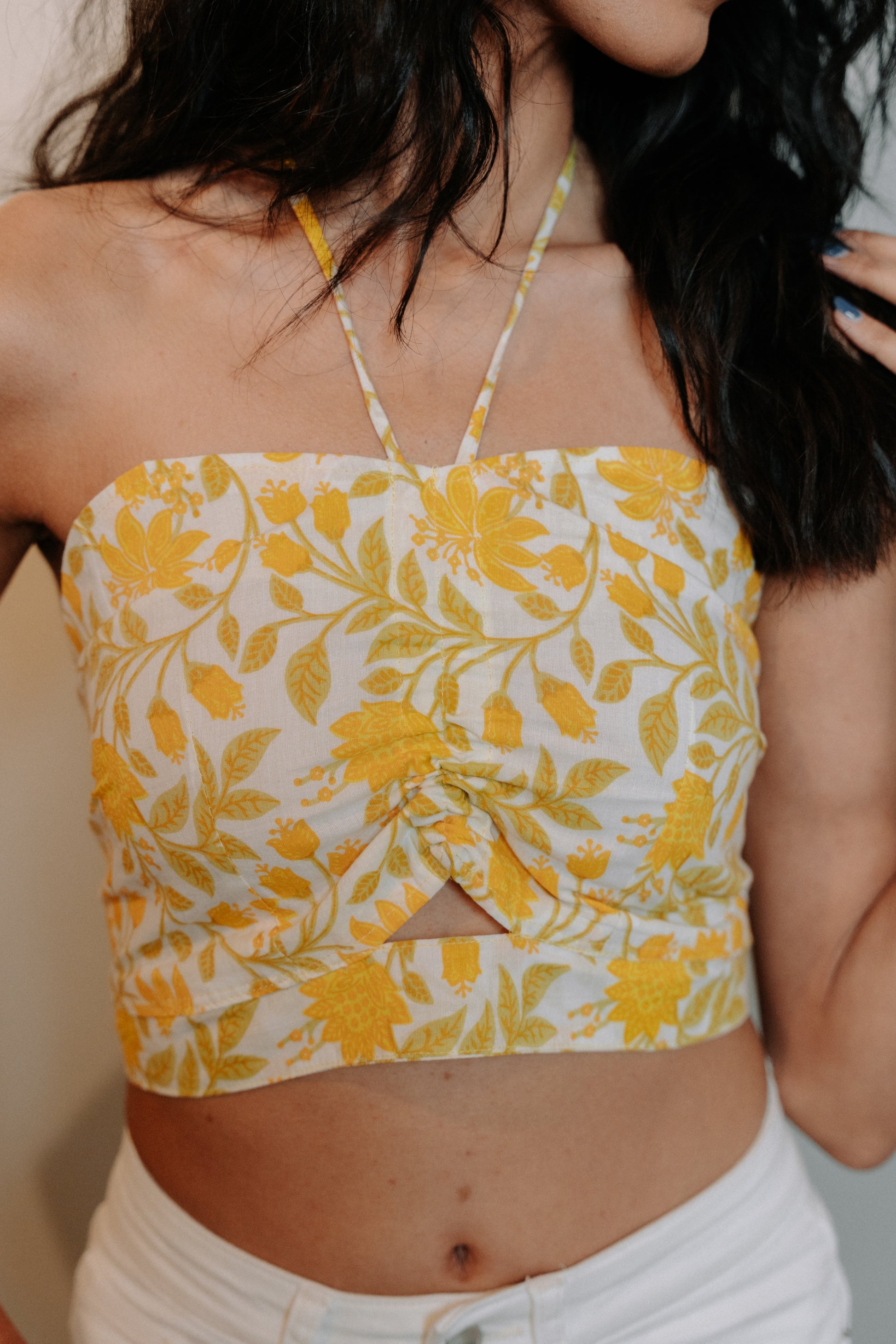 Cotton crop top that is hand block printed using natural and oranic dyes. Featuring a halter neck, back tie and scrunch tie detail at the front. The top is padded giving the ultimate comfort!