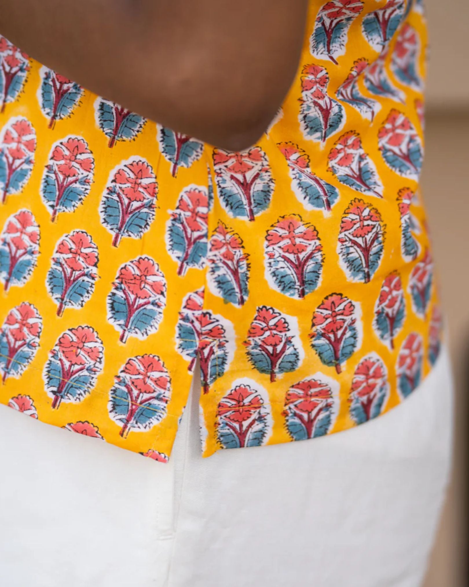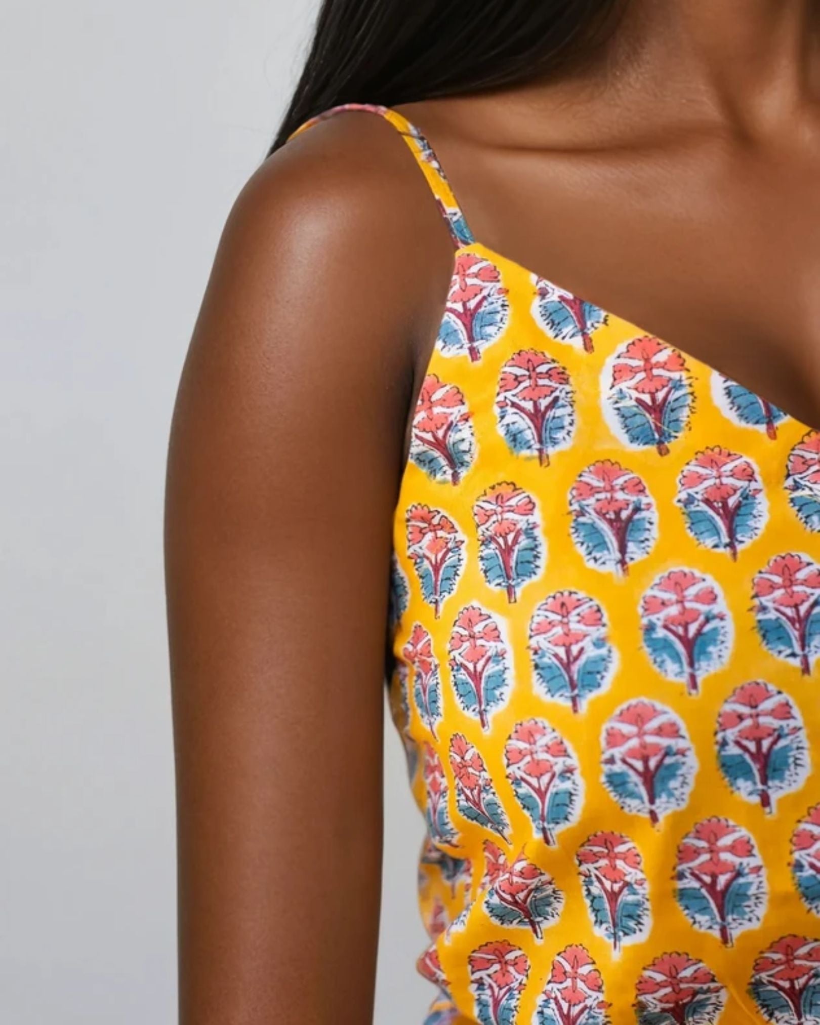 This sunlit spaghetti strap top is crafted from soft hand block-printed cotton, splashed with vibrant red and teal floral motifs against a bold yellow base. Lightweight, breathable, and effortlessly flattering, it's a go-to for warm days, festivals, or whenever you're chasing the sun.