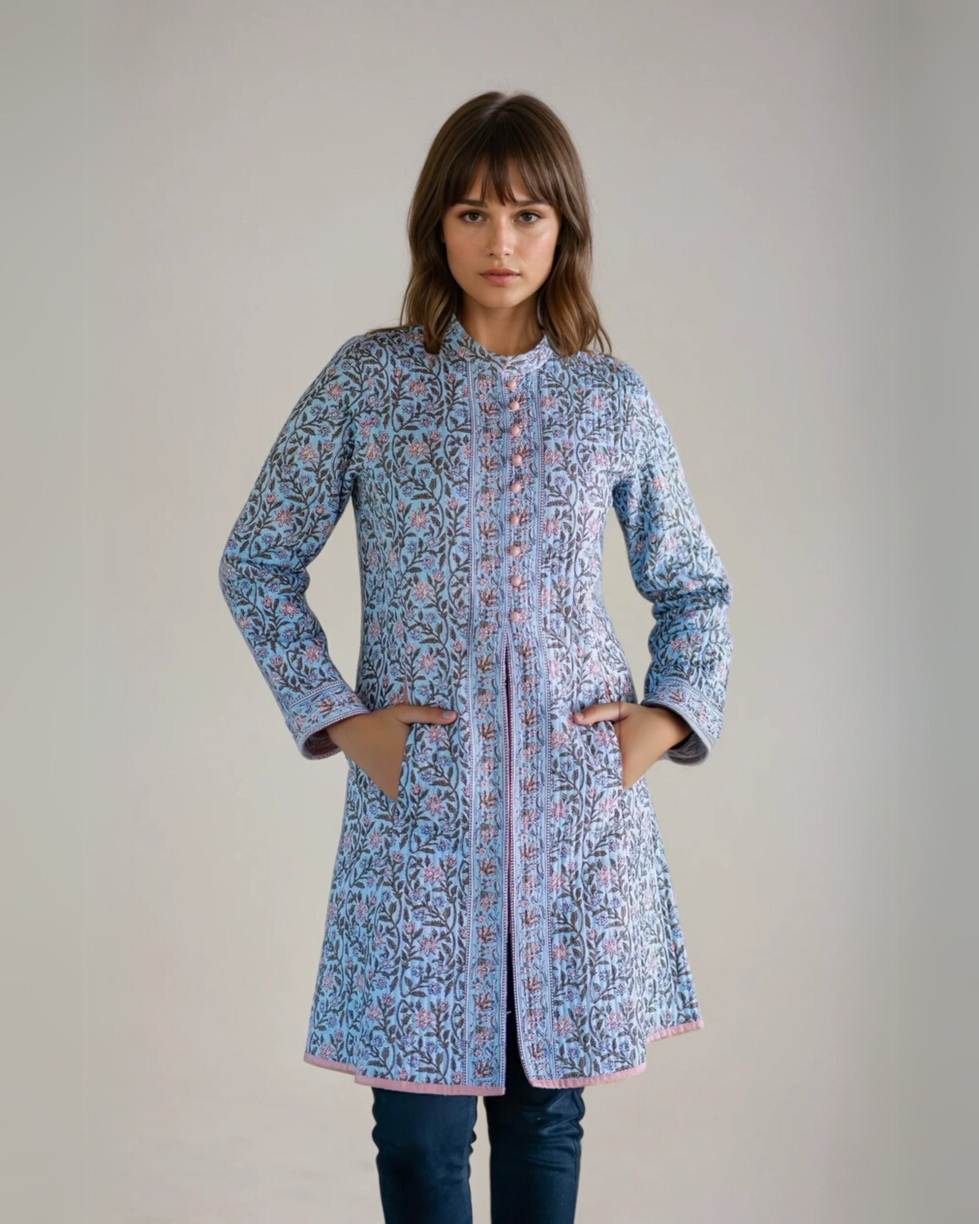 Light, airy, and effortlessly elegant, Spring is a quilted long jacket designed to move with you. Handcrafted by artisans in India, this piece features intricate hand block-printed floral patterns in soft pastel hues, evoking the freshness of the season. The center split adds a graceful flow to its structured silhouette, allowing for ease of movement and versatile styling.