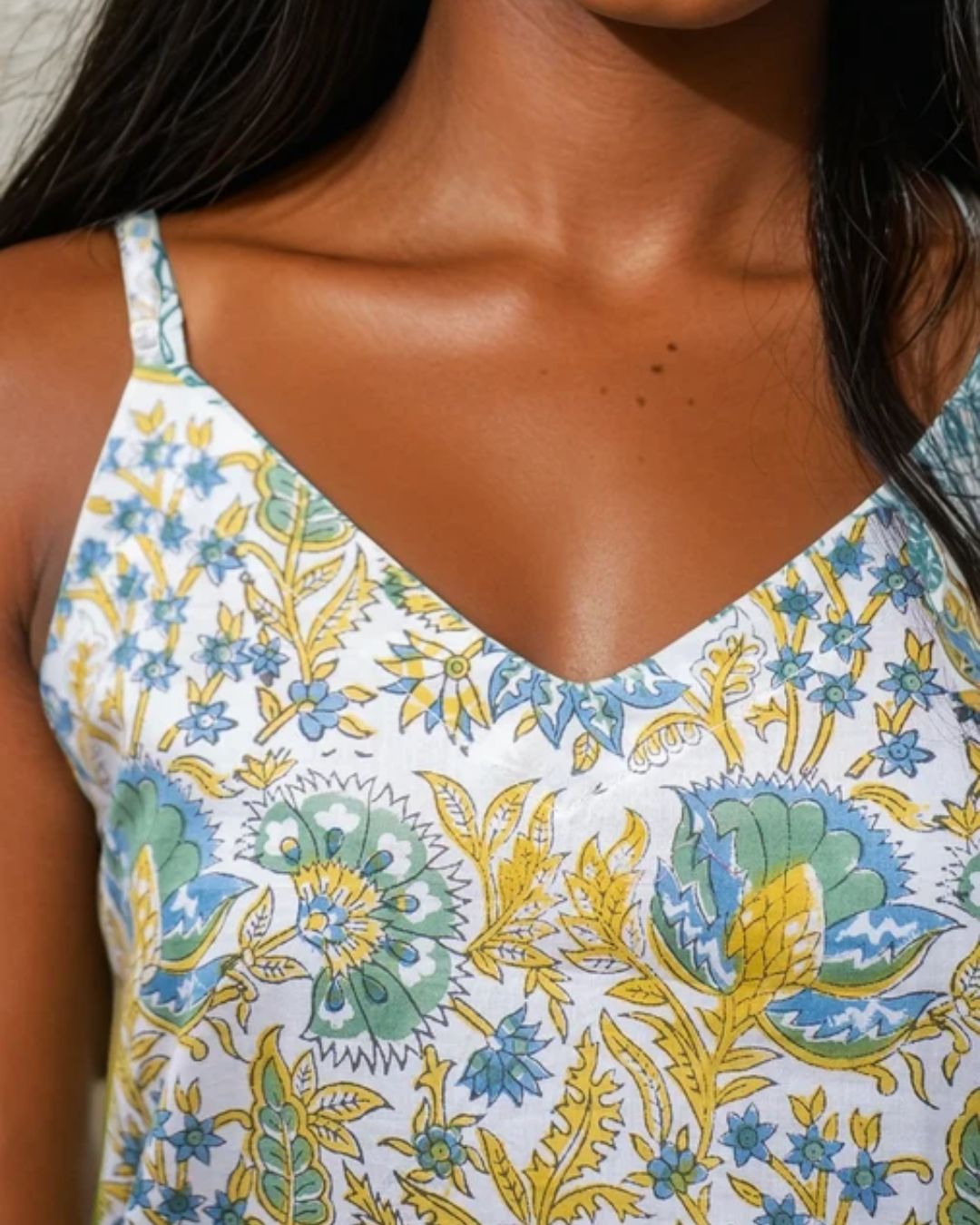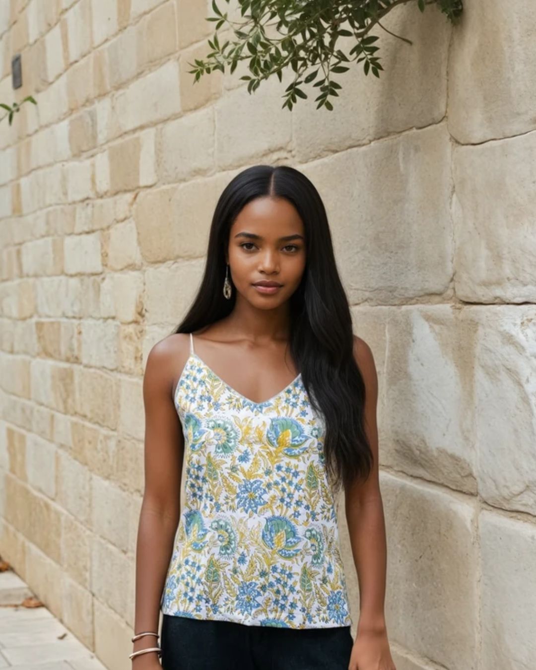 This floral spaghetti strap top is hand block-printed in tones of teal, sunshine yellow, and soft green — a wearable nod to nature’s palette. Made from breathable cotton, it's designed for hot days and carefree outings, with a flattering neckline and an easy silhouette that pairs effortlessly with your favorite bottoms.